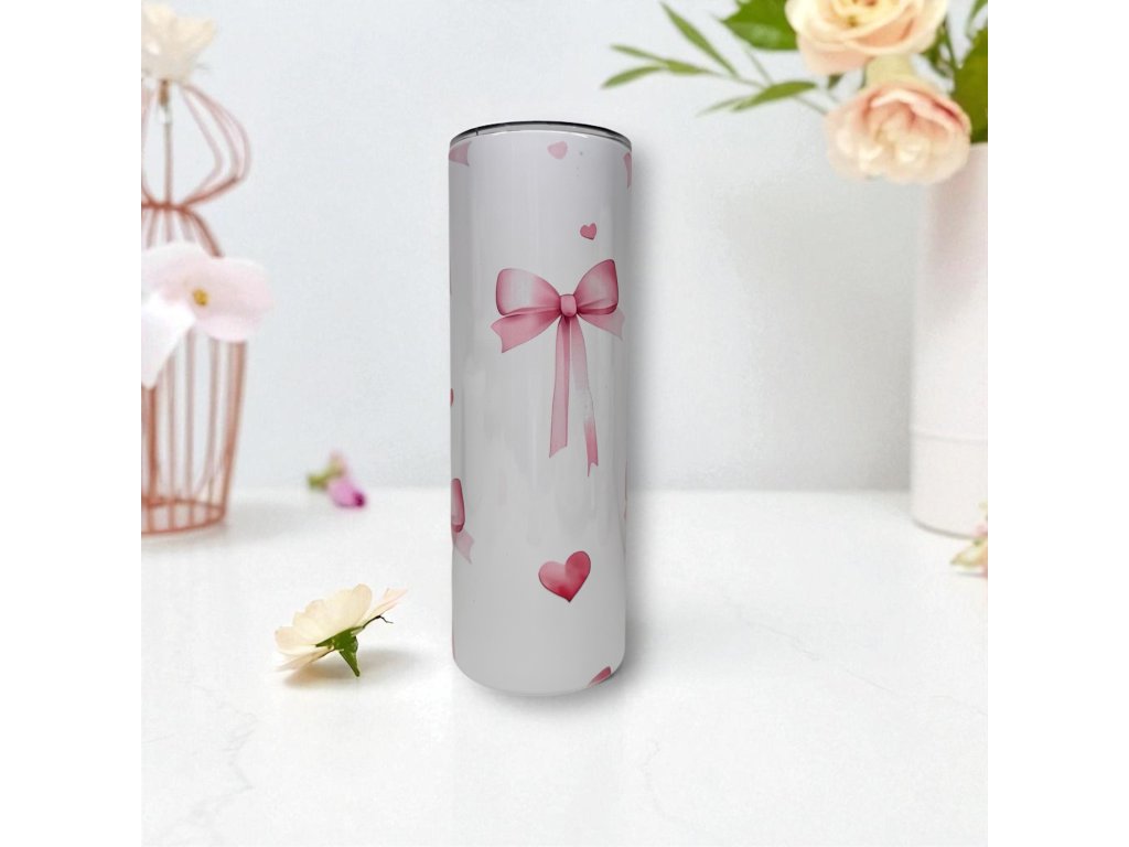 Jednoduchý a čistý dizajn s jemnými ružovými mašličkami a srdiečkami.