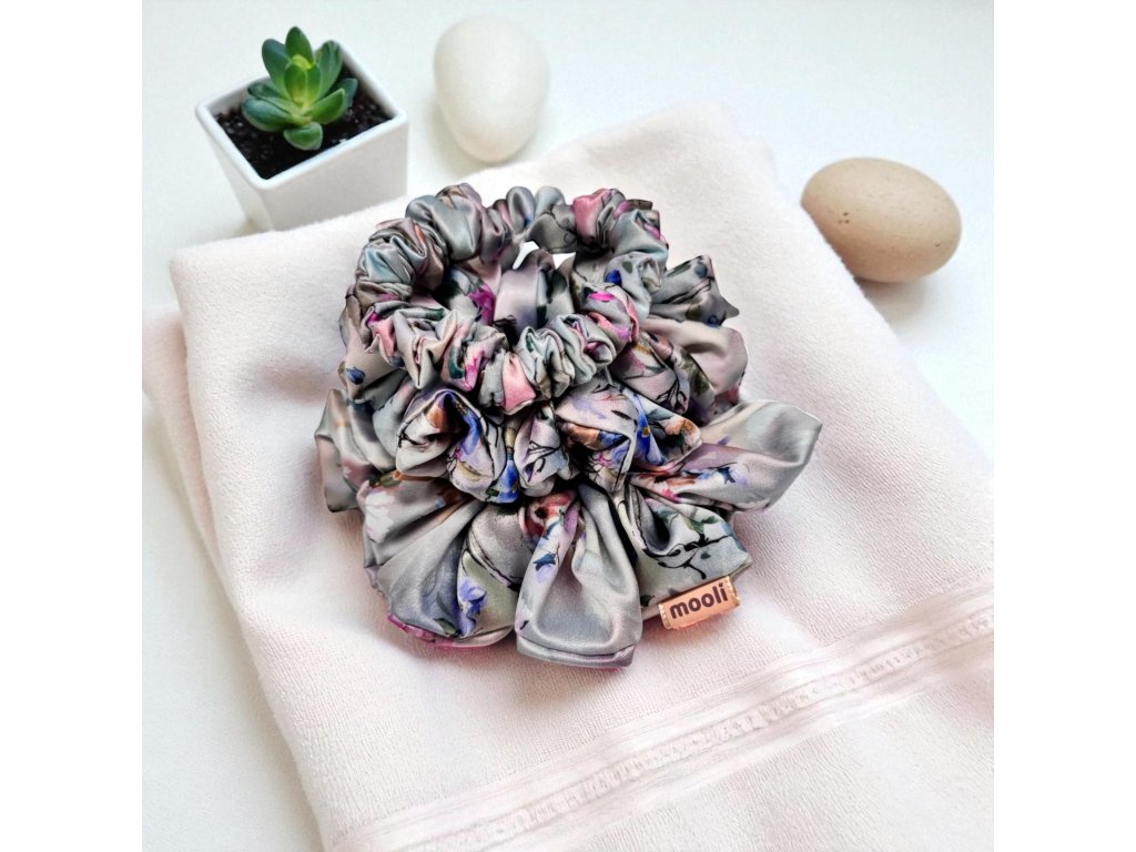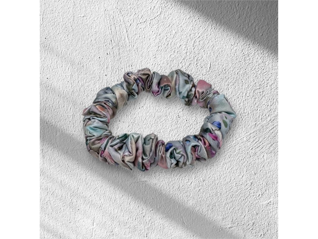 Malá saténová scrunchie s jemným leskom a nežným kvetinovým motívom.