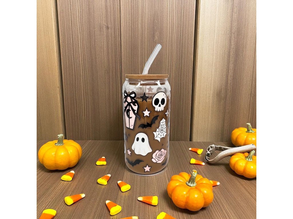 Dokonalý mix strašidelna a roztomilosti! Tento pohár si zamiluje každá duša, čo si fičí na Halloweene celoročne. Lebky, netopiere, duchovia aj rakvičky v pastelových odtieňoch – všetko s jemným leskom a nádychom tajomna. Ideálny na pumpkin latte, iced coffee alebo tvoj denný elixír.