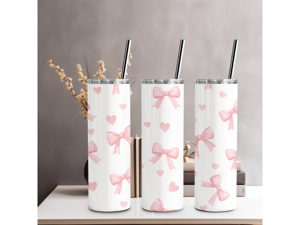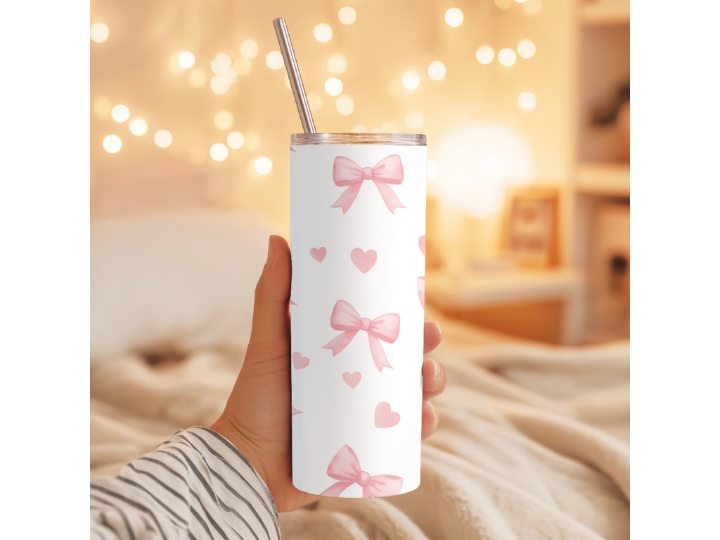 Rozkošný termohrnček s jemnými ružovými mašličkami, ktorý rozžiari tvoj deň.